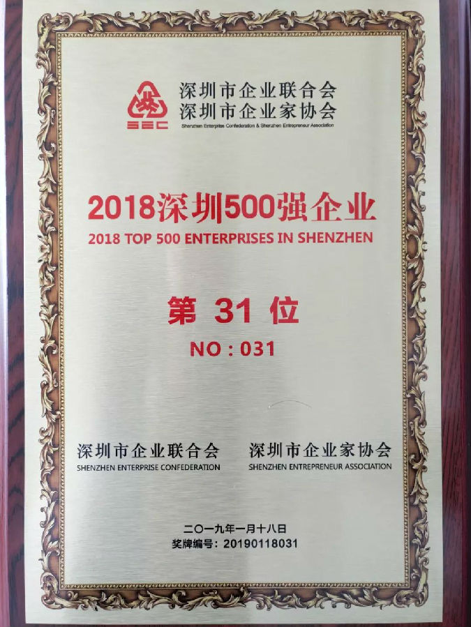 尊龙凯官网入口控股能够在深圳众多企业中脱颖而出,荣获“深圳500强”第31位,批注晰尊龙凯官网入口控股自身强盛的综合实力、优异的谋划效果、强盛的品牌优势和卓越的社会孝顺,受各级向导及投资者的普遍关注。